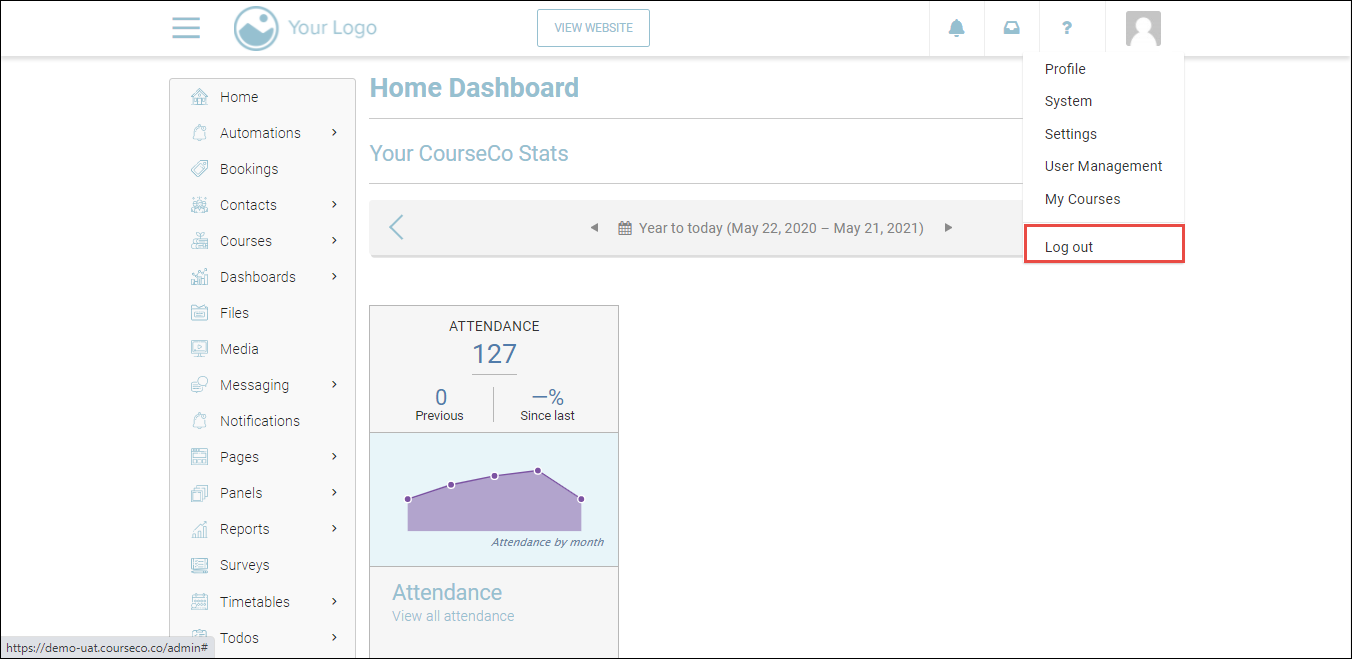 To log out of CourseCo, click your profile picture at the top-right and then click Log out.