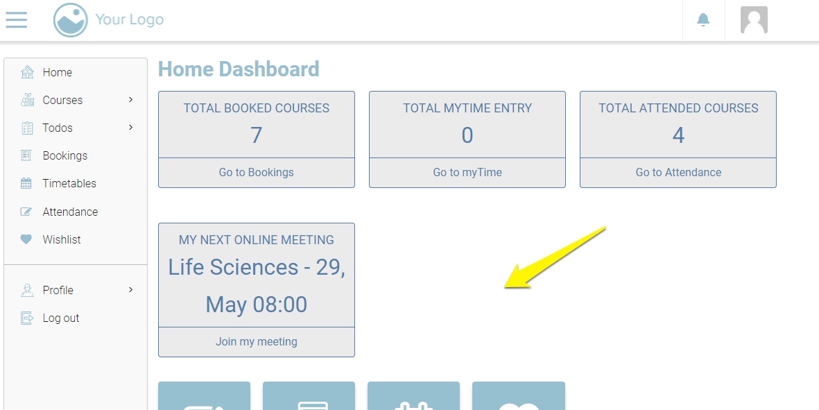 You can see a widget with the date and time of your online meeting and your course title.