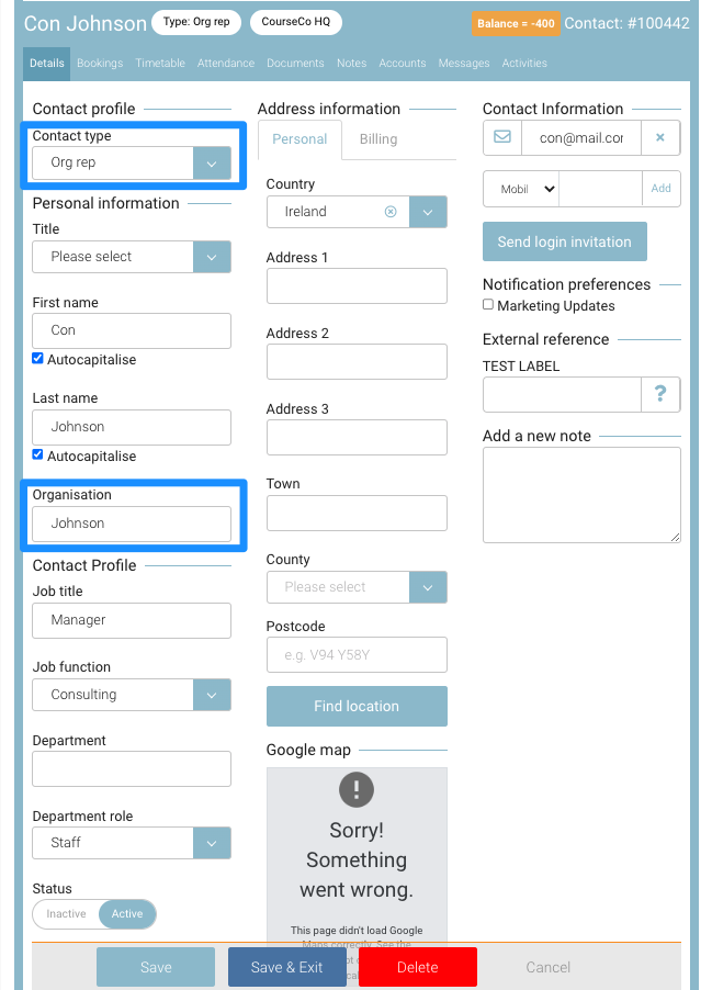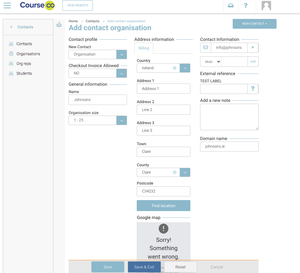 Click Save to save the organisation contact