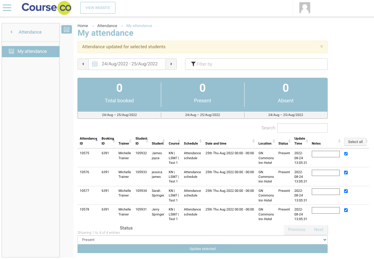 Click on ‘Update selected’ button to update attendance status of the selected students
