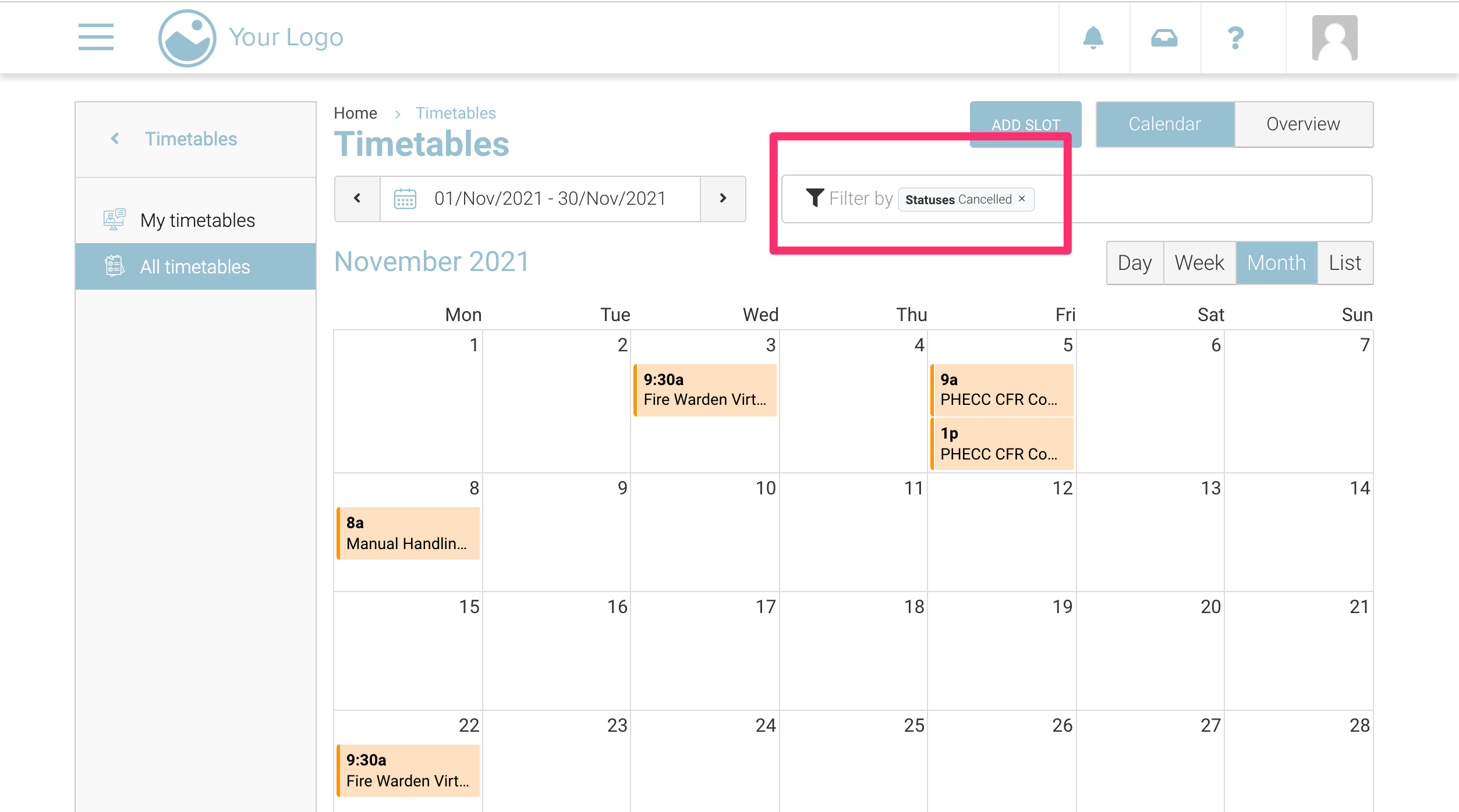 If an admin cancels an upcoming schedule it is marked as ‘cancelled’ on the timetable planner. This cancelled schedule will appear in orange on the timetable