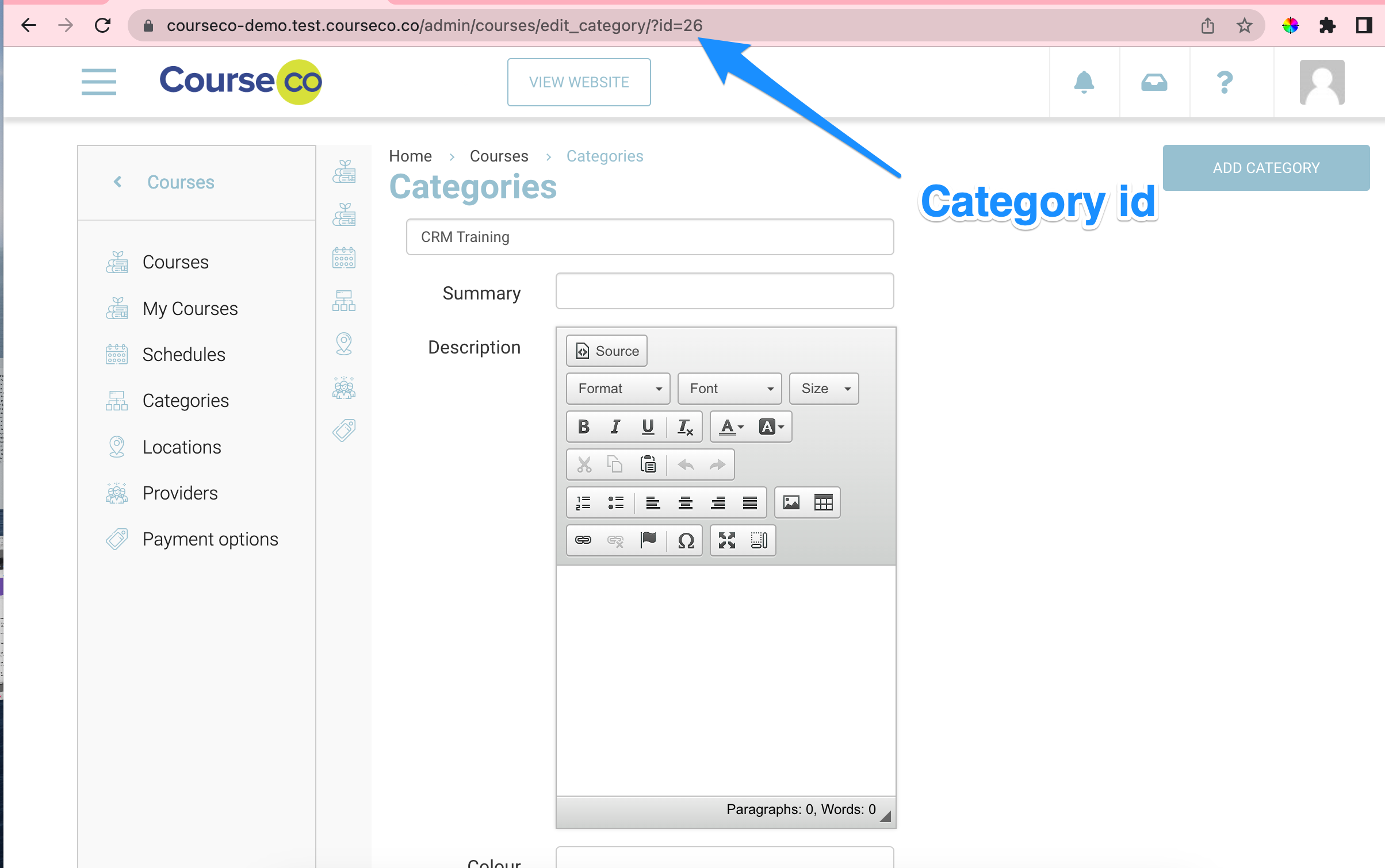 example https://yourdomain/admin/courses/edit_category/?id=1