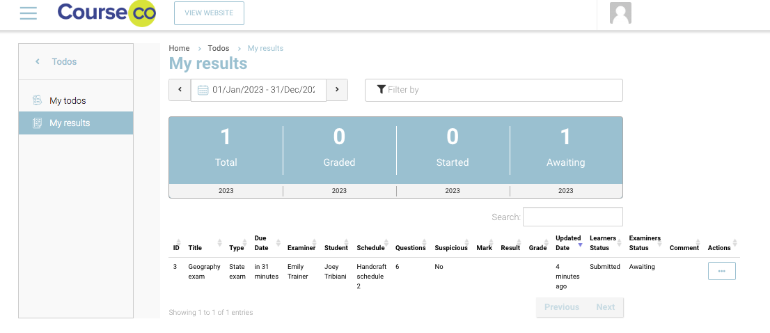 You will be redirected to Todo records for submitted exams. In this image below, only 1 submission is received. It may vary trainer to trainer.
