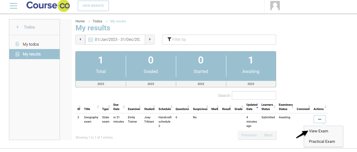 You will be redirected to Todo records for submitted exams. In this image below, only 1 submission is received. It may vary trainer to trainer.