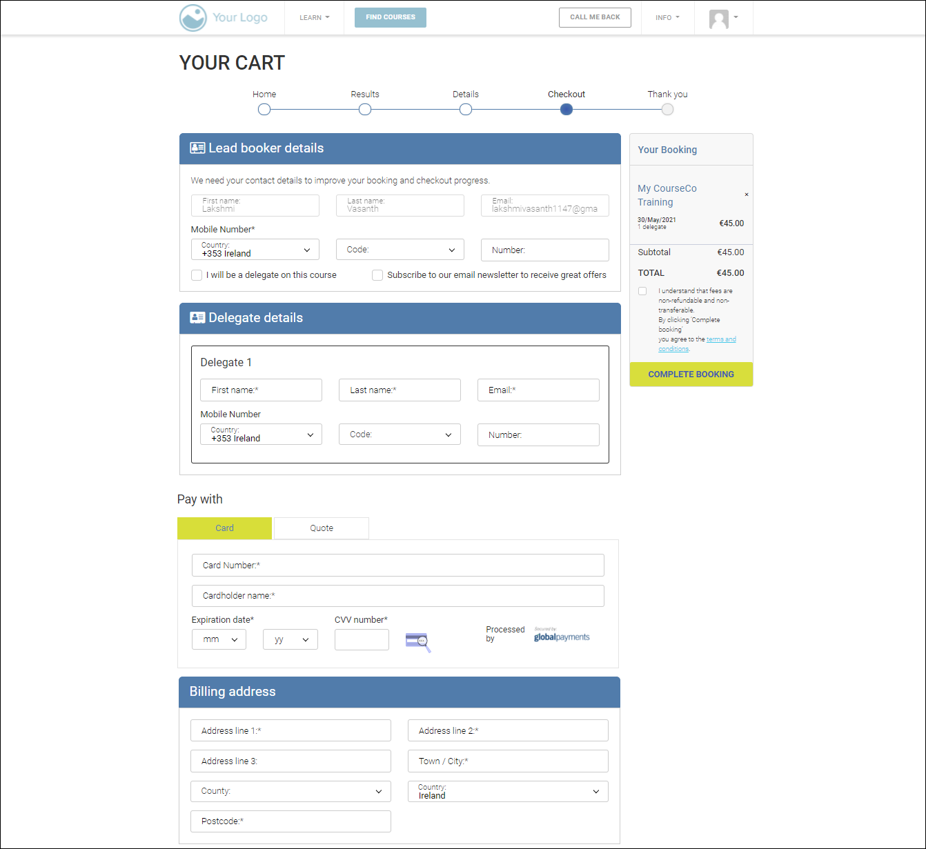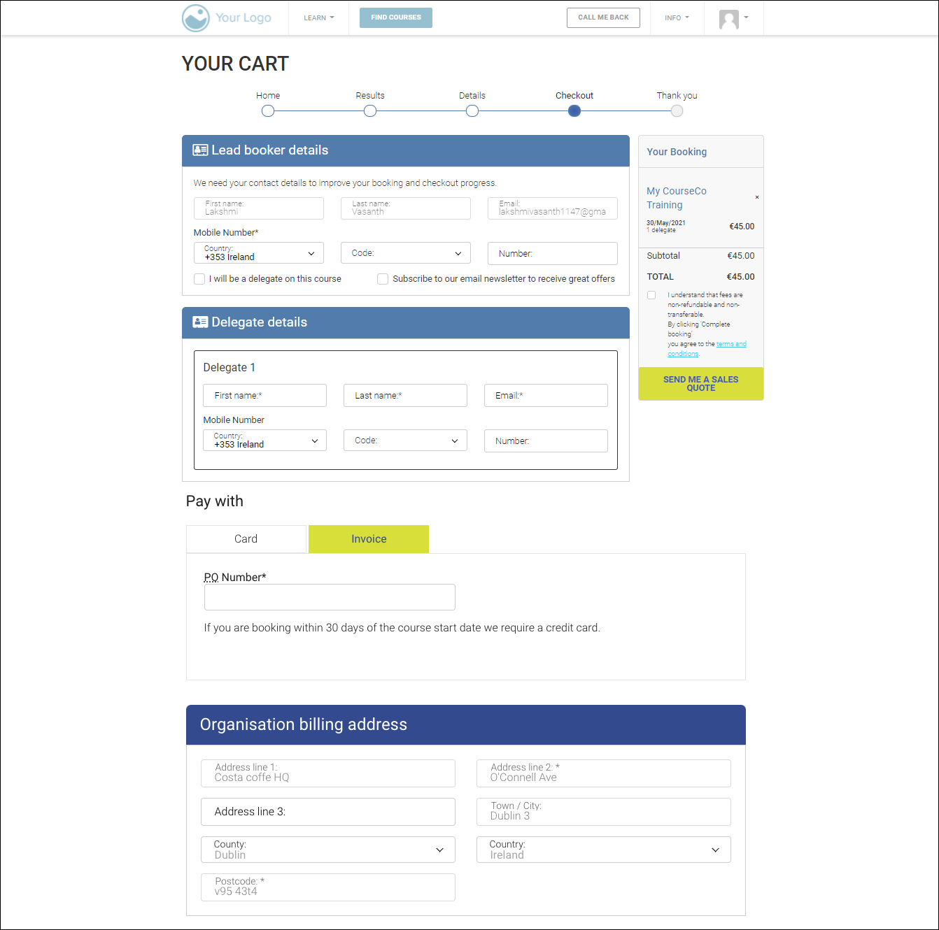The booking will be confirmed. A paid transaction will be processed on CourseCo. Your payment gateway will receive your payment and transfer your linked bank account. A confirmation email will be sent to the lead booker. Booking details will also be sent to delegates that have been booked on to the course.