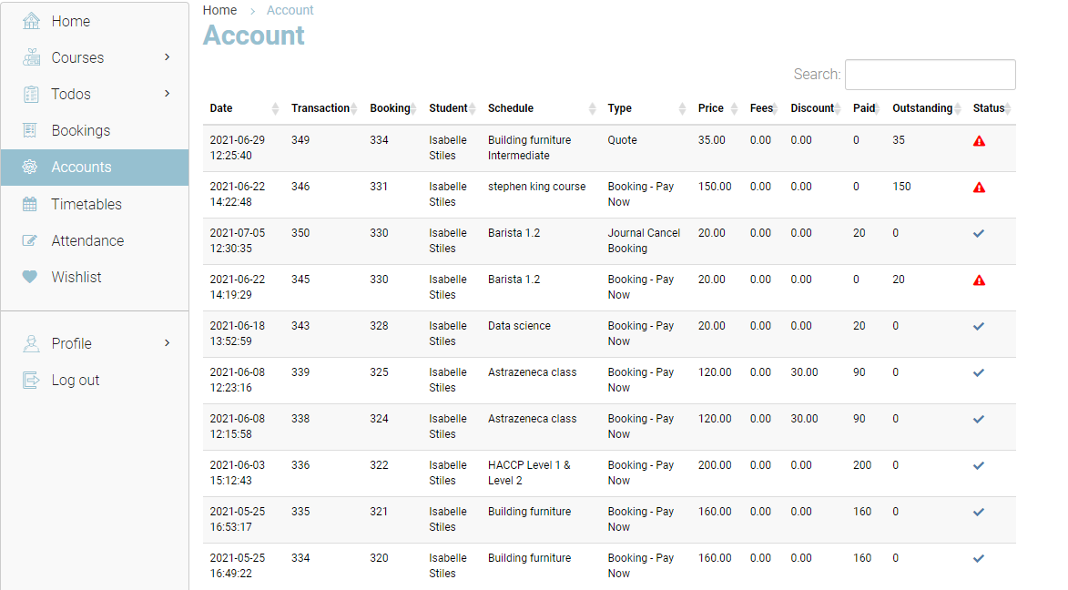The Accounts page will be displayed. The overview of all the accounts including details such as Date, Transaction, Booking, Student, Schedule, Type, Price, Fees, Discount, Paid, Outstanding, and Status will be displayed. If you are an Org Rep, you will be able to see all of the bookings you have made for your staff.