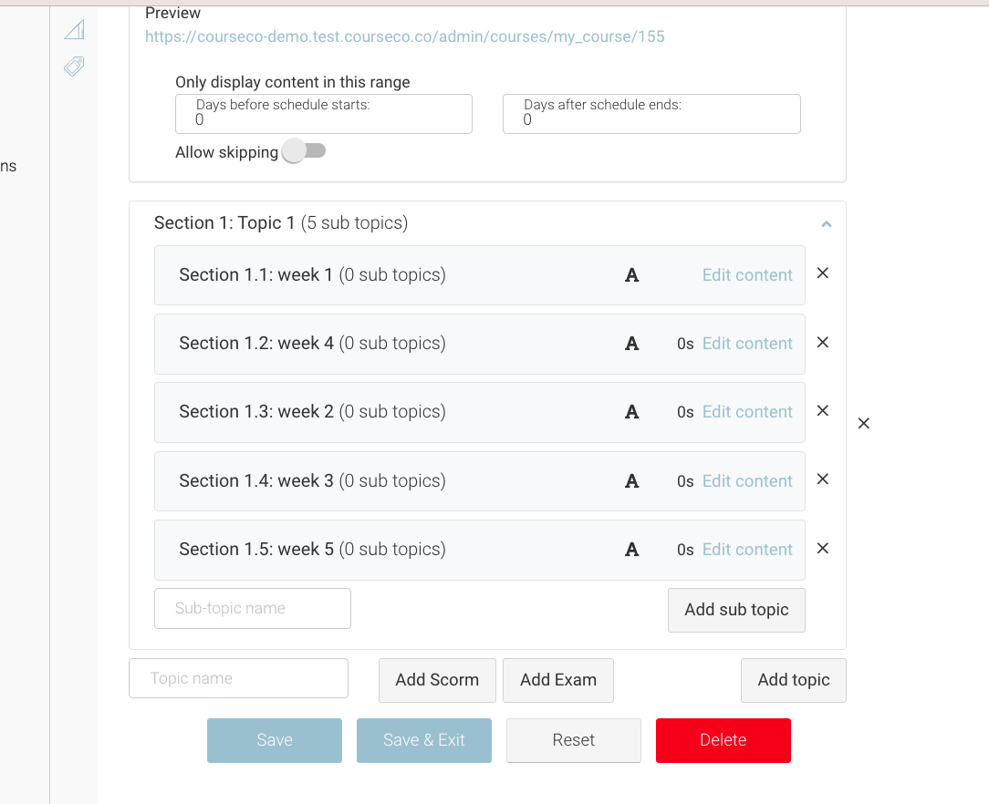 Building out your topics and Sub-topics is like building out your chapters of a book, you have chapters and sub headings. Other people see it like building power point slides. Ensure you consider this when titling your eg Section 1 and sub topics!