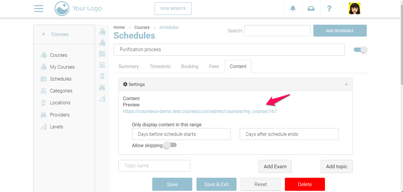 To embed an exam in the content tab for a schedule, please follow the article here: https://help.courseco.co/kb/Questionnaire.2462384164.html