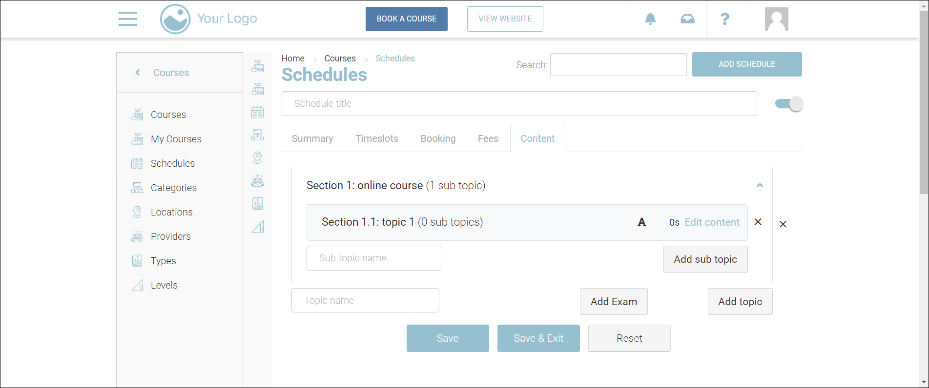 This section explains the process of adding different type of content to the sub-topics of your course material.