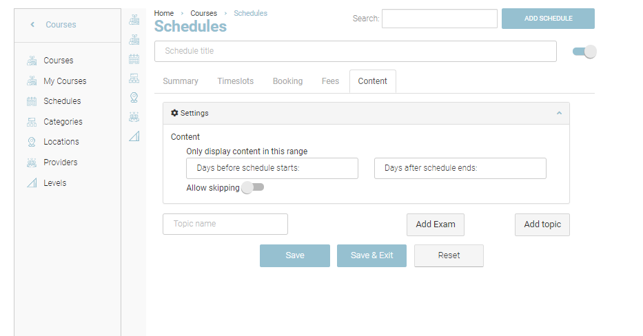 Days before schedule starts and Days after schedule ends fields. You can use this feature if you plan to update the content gradually for your students to see.