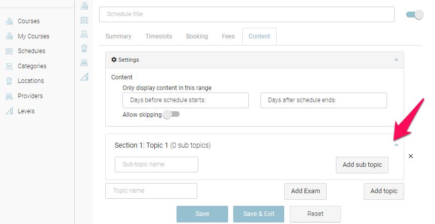 9. To add a sub-topic under a topic, expand the topic section by clicking on it. Enter the name of the sub-topic and click Add sub-topic.