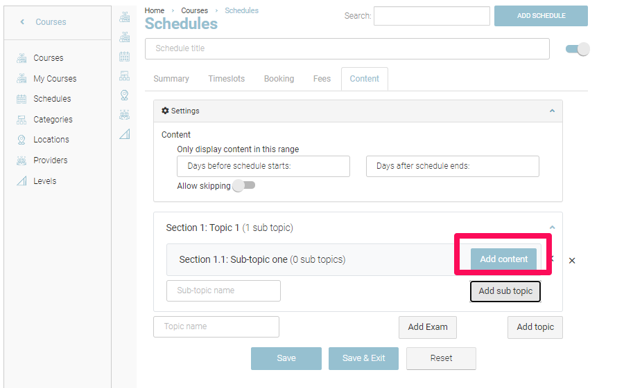1. Click Add content next to the Sub- topic to which you want to add content.