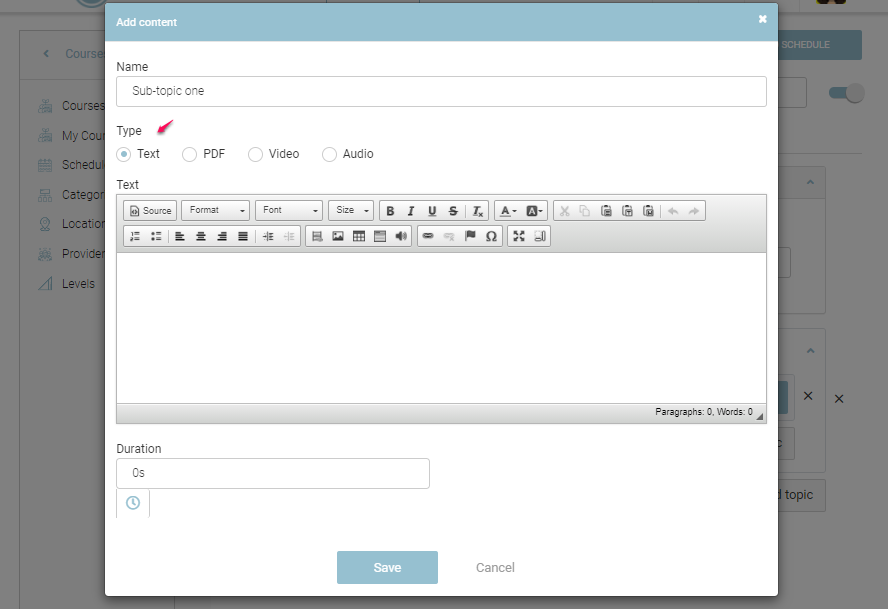 The Add content dialog will be displayed. By default, the sub-topic name will be displayed and the content type will be selected as Text.