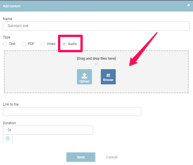 This section explains the process of adding audio files to the sub-topics of your course. To add an audio file, follow the steps given below: