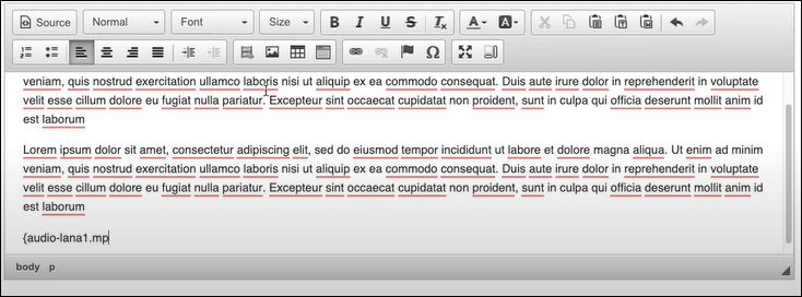 8. Enter the audio name where you want it to be embedded/visible for your students, in the format: {audio name of your audio.mp3}. If the name of your audio file is risk-management-1.mp3, then enter {audio-risk-management-1.mp3}