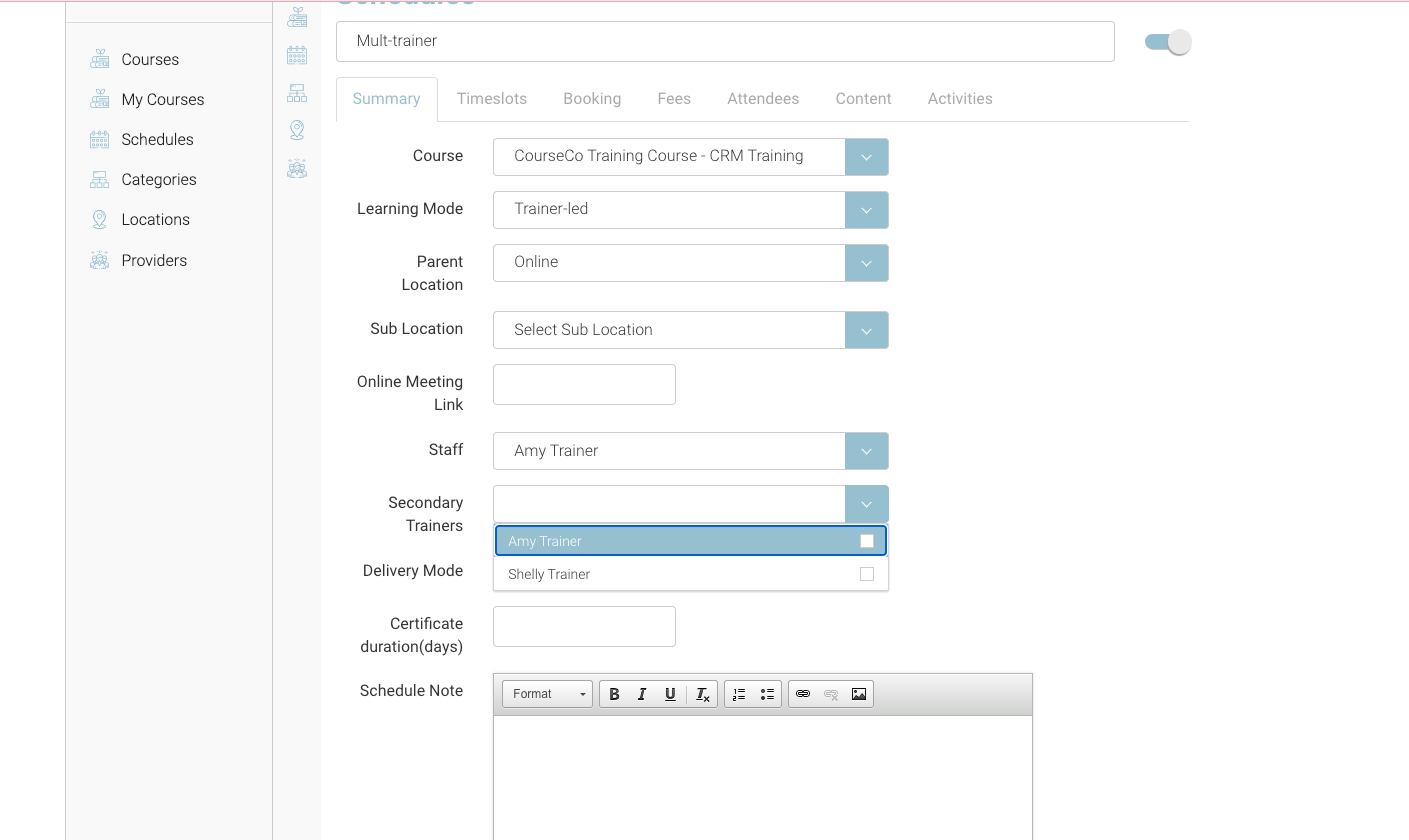 CourseCo has enhanced the schedule setup process to allow multiple trainers on a schedule. We found through discussing workflows with our clients, that in some cases, there might be multiple trainers in the room that need to see the timetable, update attendance, view the online content on a schedule. So, we developed a new feature to allow multiple trainers on an overall schedule.