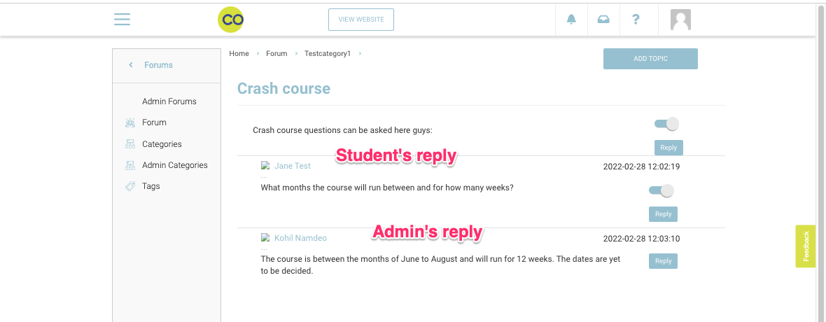 Outcome: Your reply on the topic as an admin will be posted and available for students to view