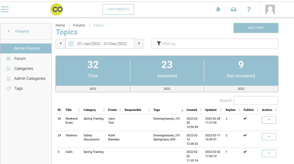 Forum Statistics page is useful to filter results and see high-level stats on a category, tags or posts by specific students. With admin access you can filter results, view and edit posted topics and replies.