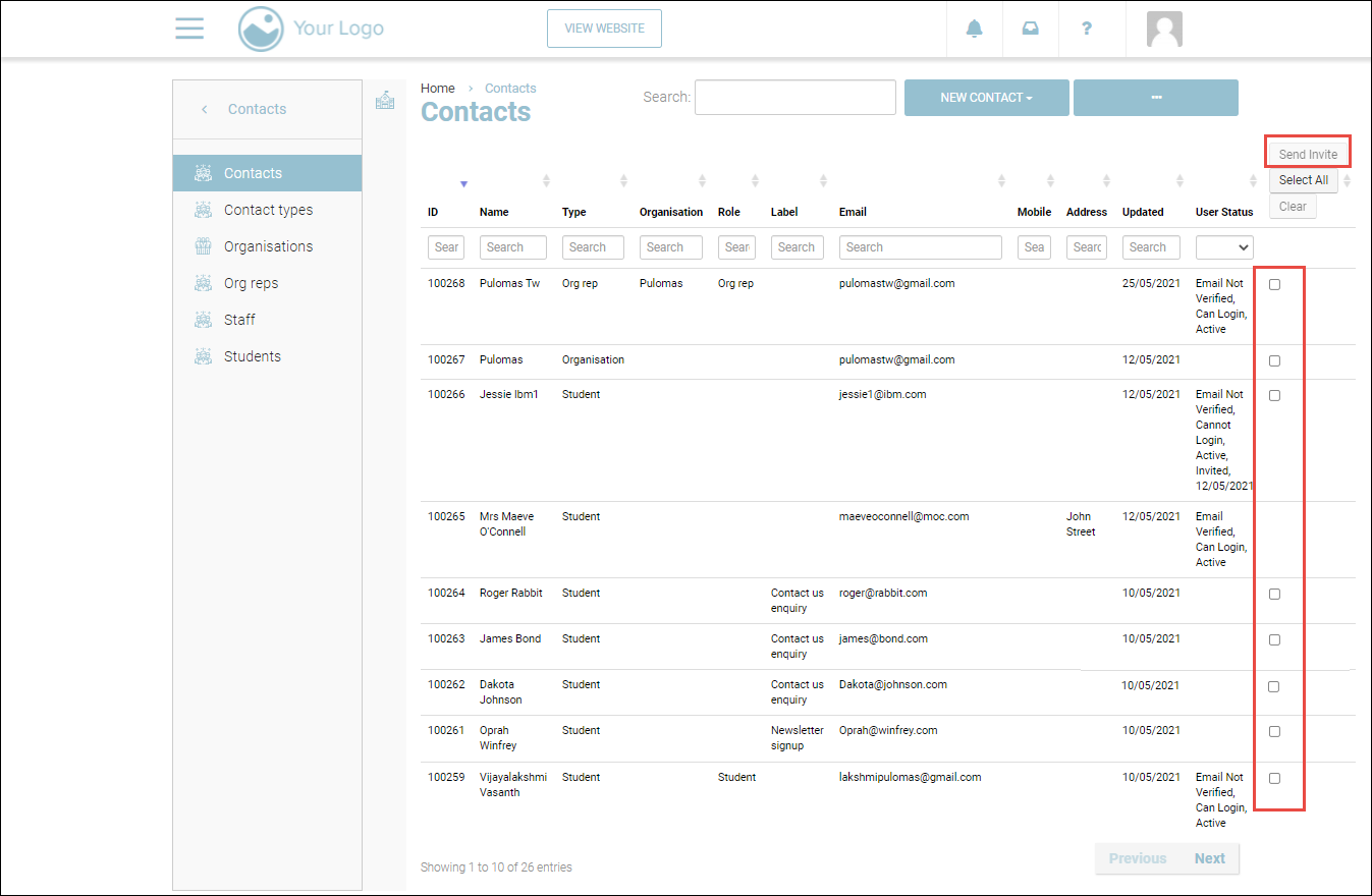 Ensure you are bulk inviting contacts with the same role i.e. Bulk invite Students then Bulk invite Org rep.