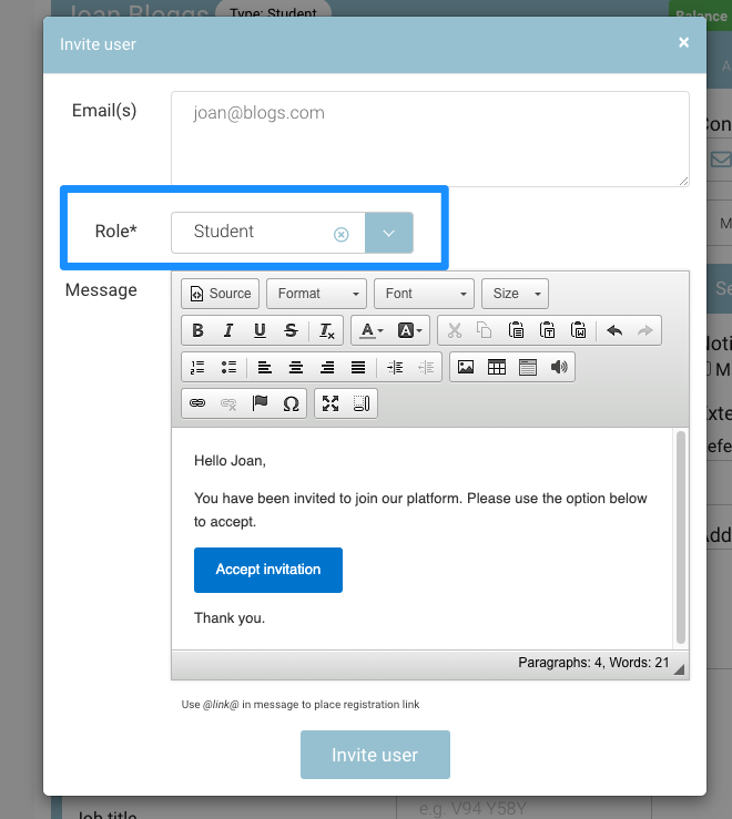 Make sure to select the correct contact Role from the dropdown as this may later affect your learner’s access