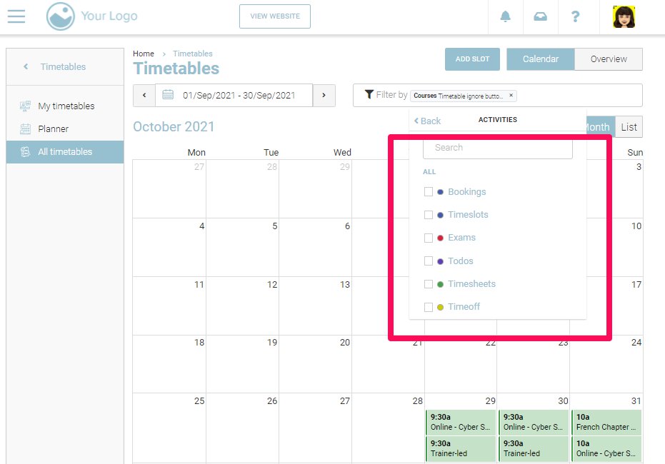 You can filter the timetable by Activities. Within activities, you can filter by Bookings, Timeslots, Exams, Todos, Timesheets, Timeoff. To understand how each of these filters work, please follow the steps below: