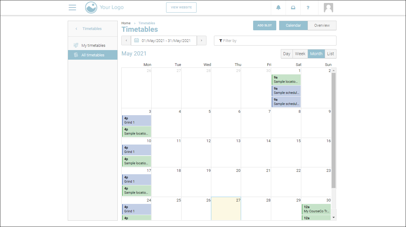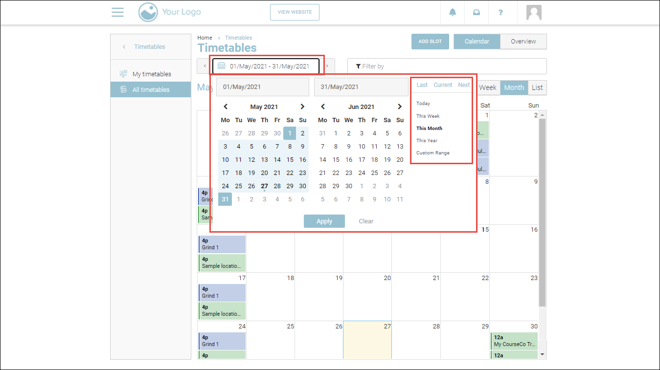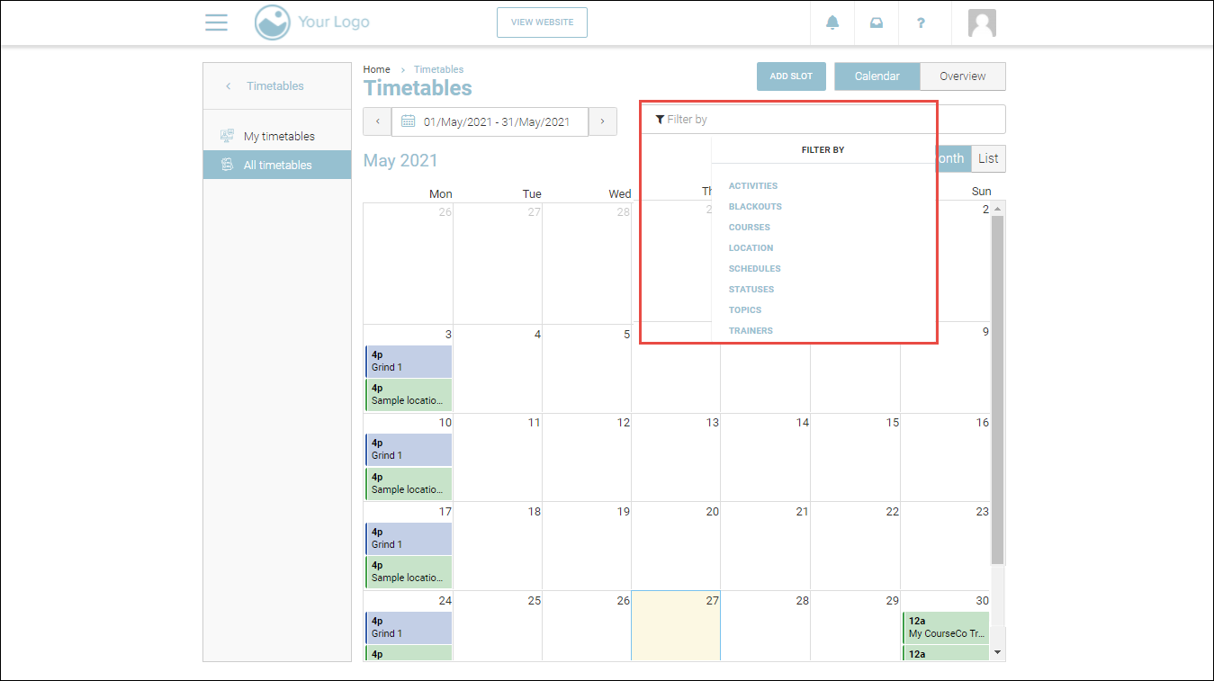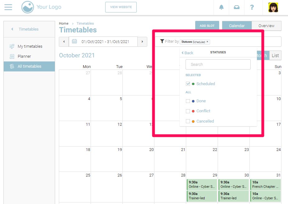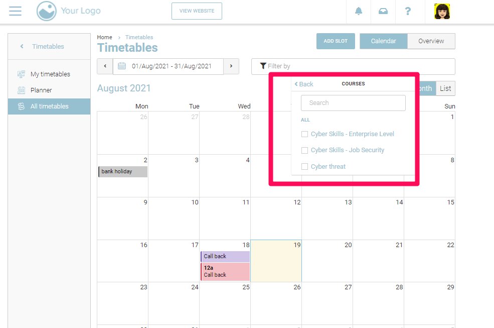 With the courses filter, you will be able to filter out the schedules with regards to the courses on your website. For example, you can select one of the courses from a list of all courses so that you can see all the schedules for the courses for the date range that you have set.