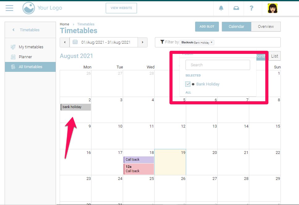 The Blackouts filter criteria can be used to view schedules on Bank Holidays and Training Days.