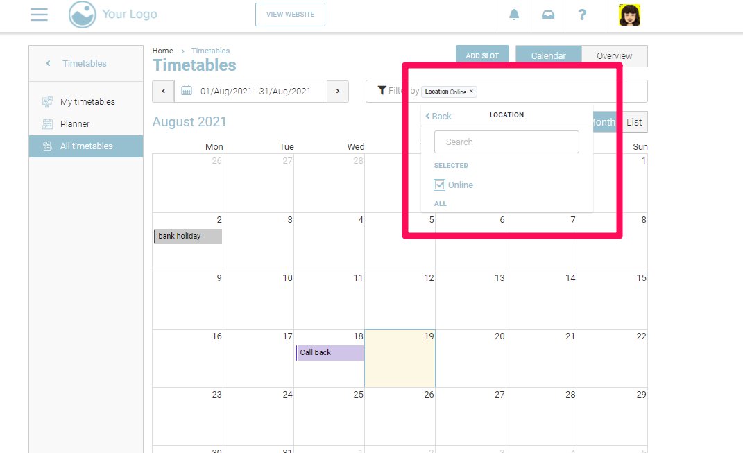 With the location filter, you will be able to filter the schedules based on what location they are scheduled for. For example, you can select any location from all the locations on your website and you can see all the schedules based on that location.
