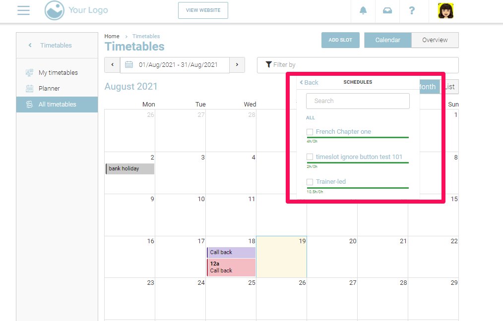 With schedules filter, you can filter all the schedules and you can see the start and end time for the schedule on the calendar. For example, you can search for one schedule from the list of the schedules on the website.