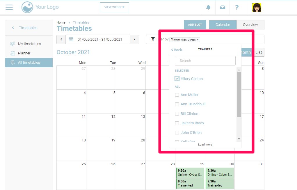 With the trainers filter, you can filter all the schedules in your website based on the trainer teaching them. For example, I can select one trainer from the list of trainers so that I can see all the schedules he is teaching.
