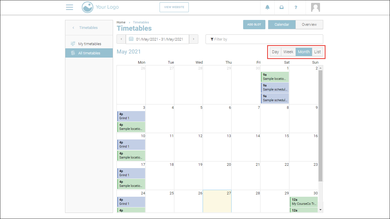 The Calendar view displays the calendar marked with all the timetables of all the courses. The below screenshot shows the Calendar view of the All timetables page: