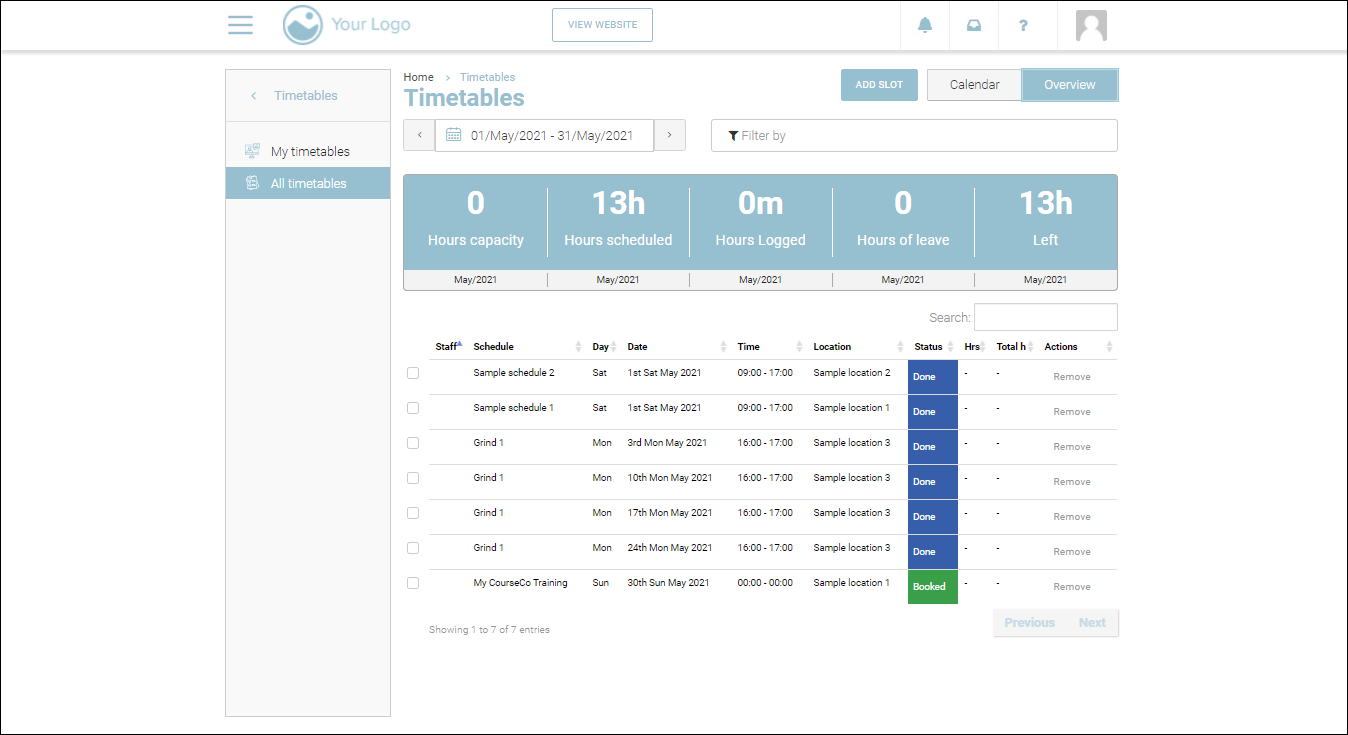 Hours logged = Number of hours the trainer have logged into the timesheet in the date range that you have selected