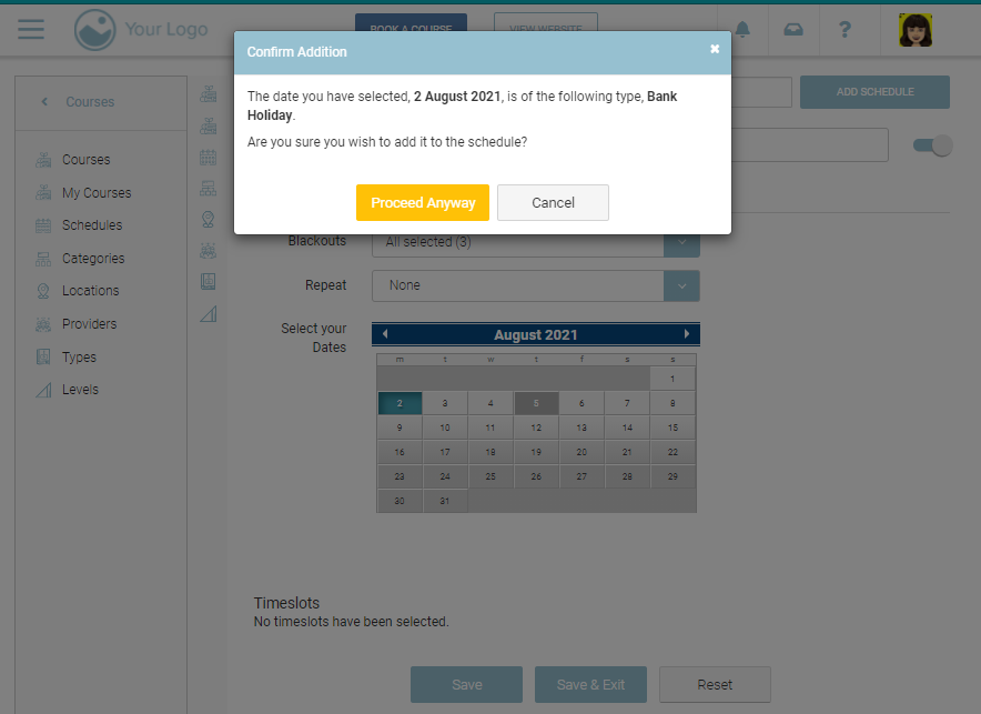 The functionality for blackouts is to ensure that you don’t schedule a course to run on a bank holiday or for other unique reasons.