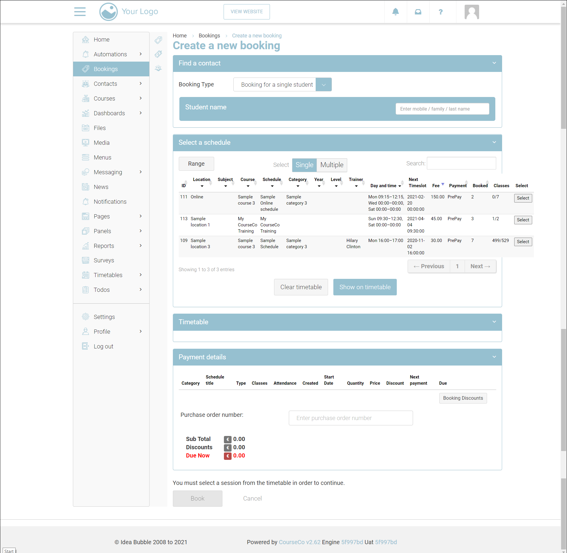 In the Student name section, search the student’s contact for which you want to add a booking. Search by the student’s First/Last name or mobile number and select the student from the suggested contact list.