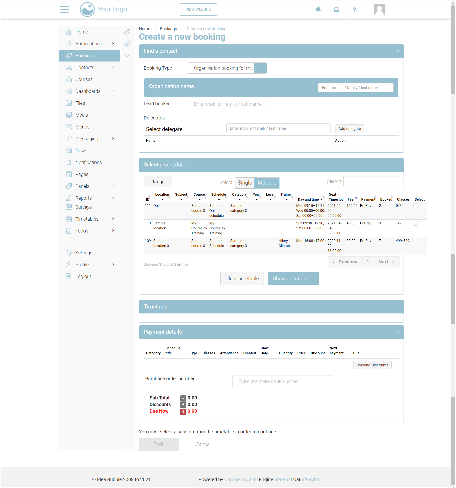 Click ADD BOOKING. The Create a new booking page will be displayed.
