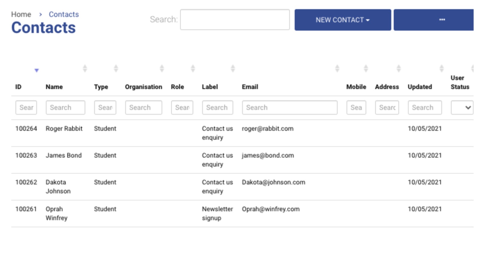 The Contacts module allows you to manage all your contacts, create different types of contacts, invite contacts, and import contacts.