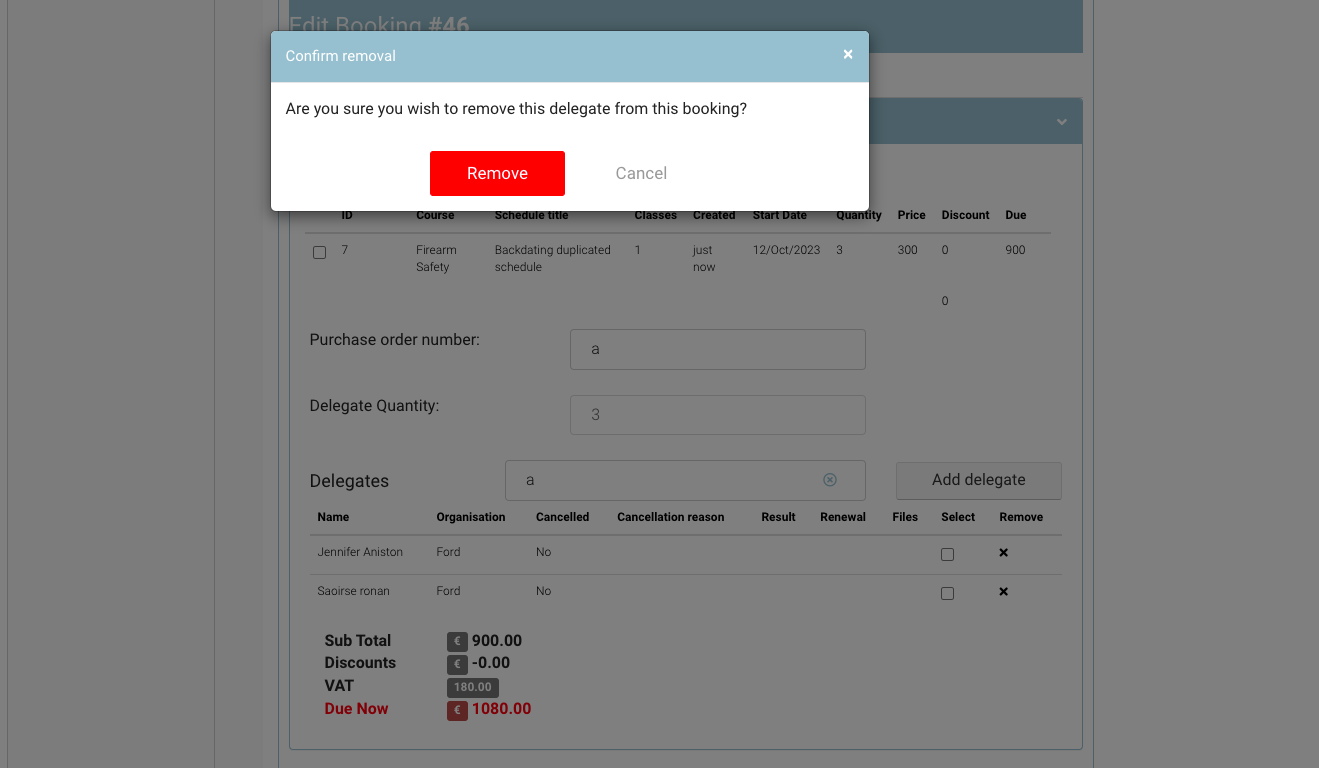 In booking details, click x in front of the delegate that you want to remove