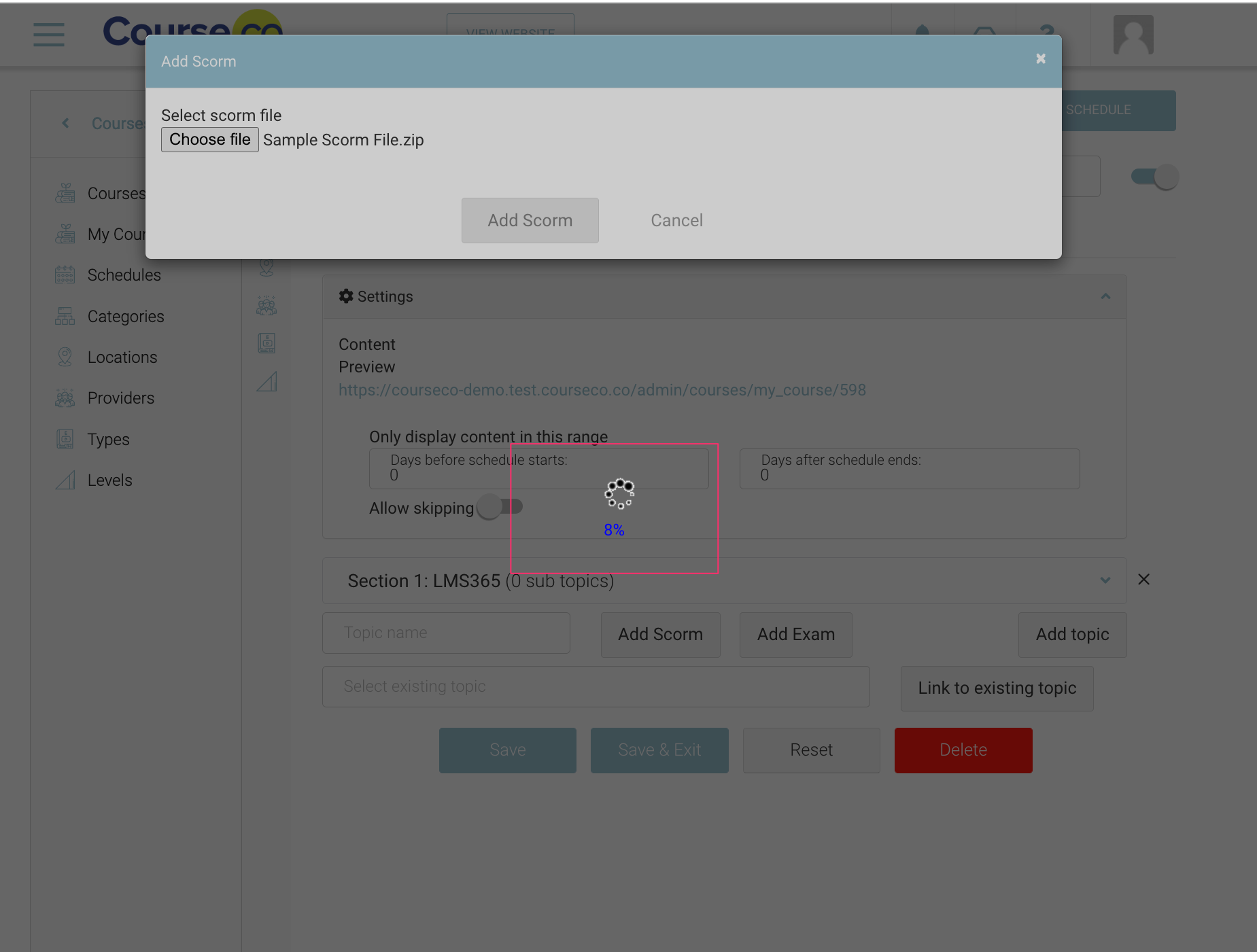 Click ‘Add Scorm’ button. You can also see the percentage of upload completed on screen. Please see the given below as a reference.