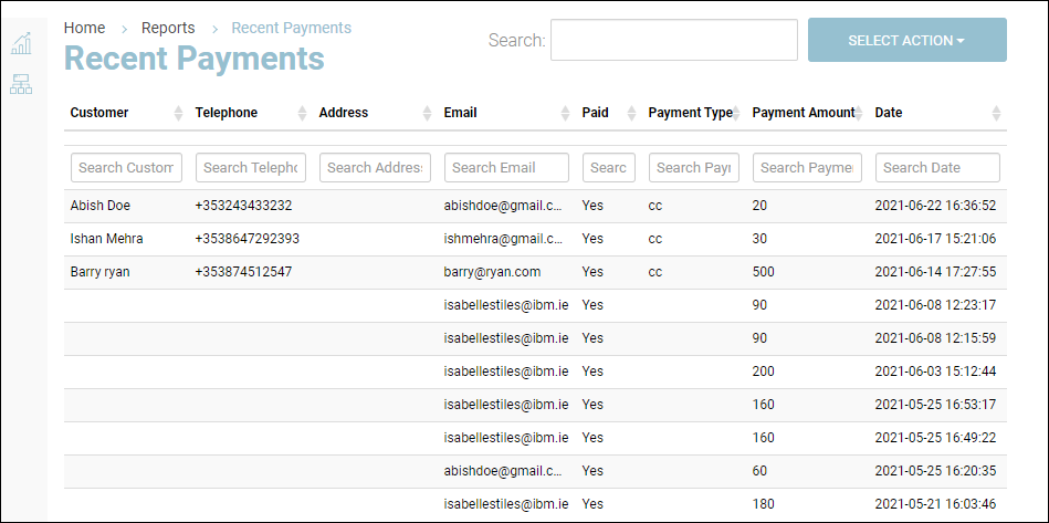 The Recent Payments report shows all payments processed through Stripe. Admins can generate, view, download, and print the Recent Payments report.