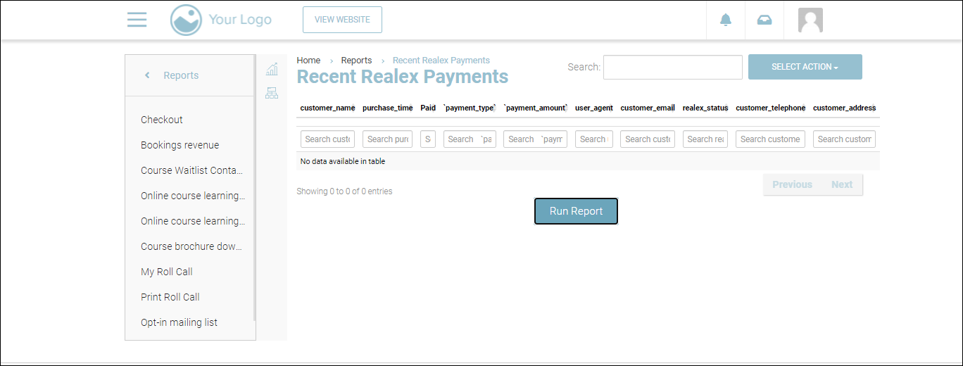 The Recent Realex Payments report shows all payments processed through Stripe. Admins can generate, view, download, and print the Recent Realex Payments report.