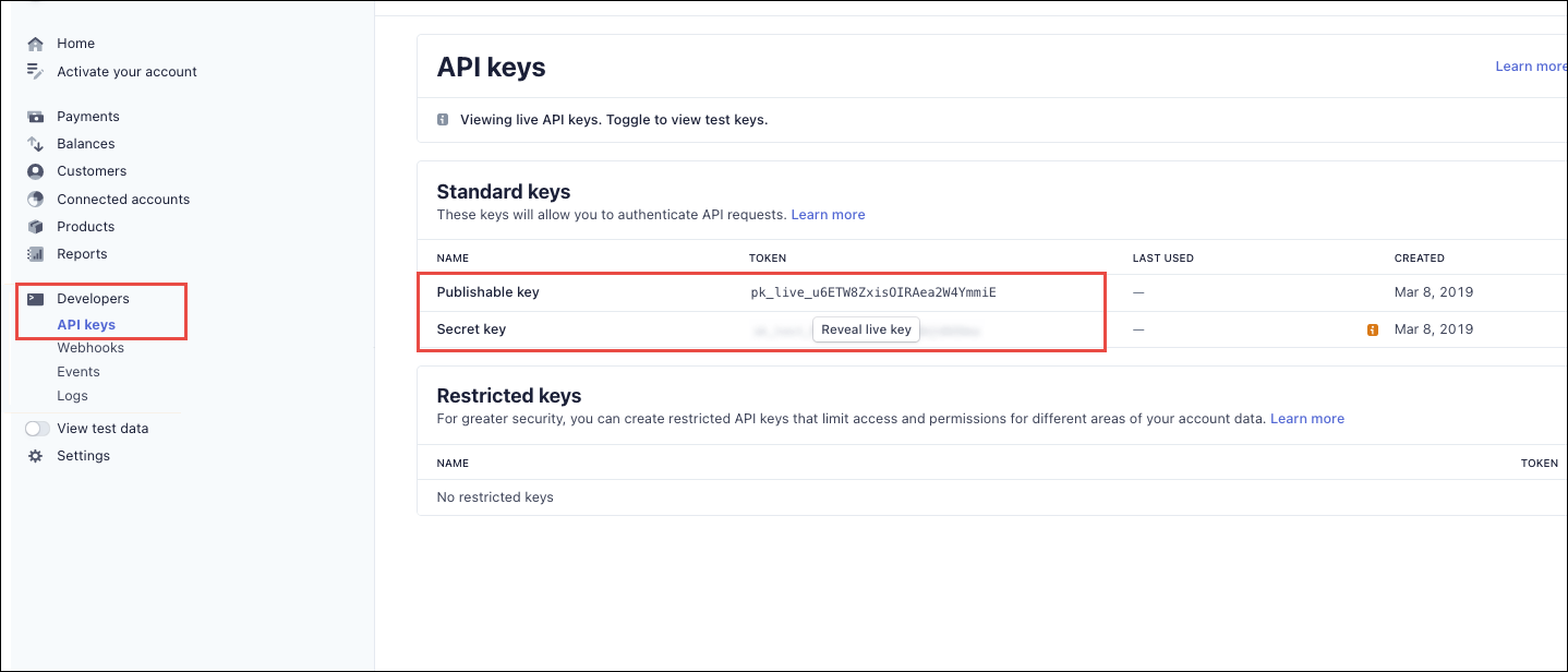 The publishable and secret keys will be displayed.