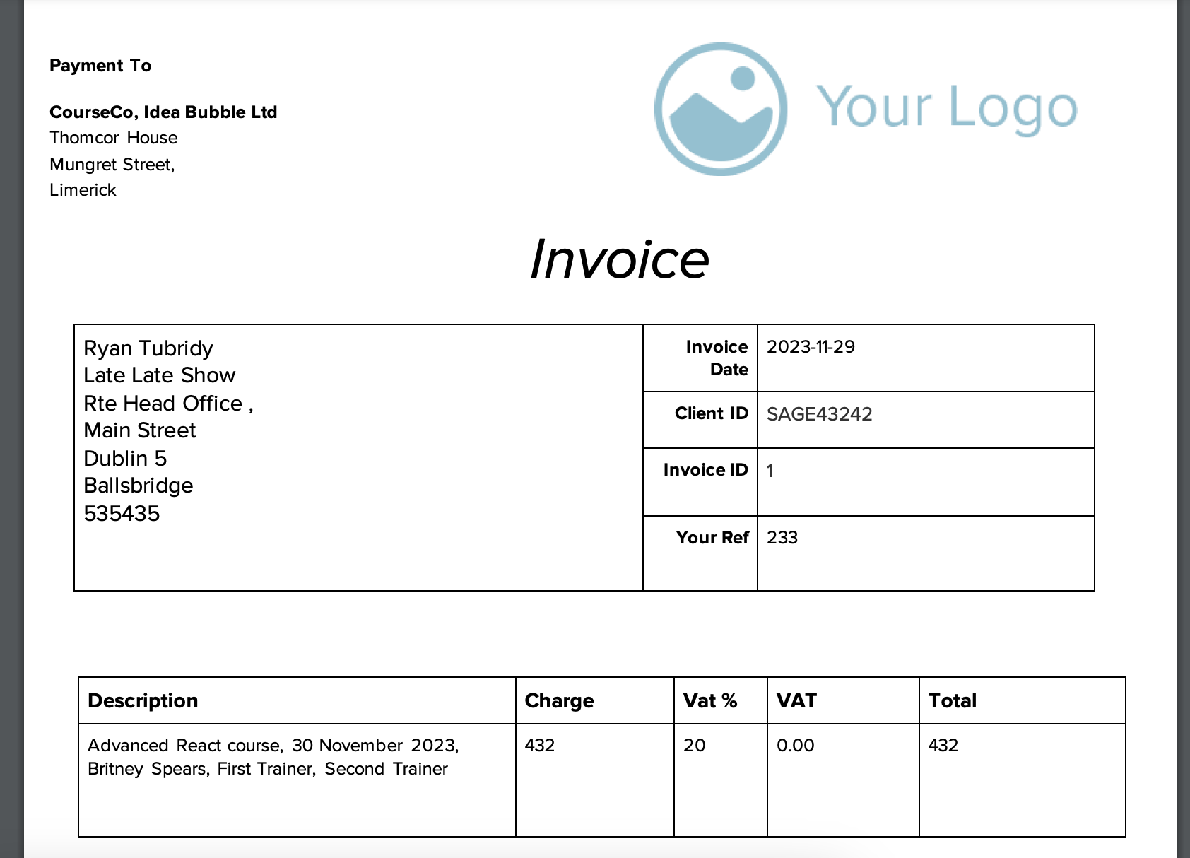 Template example of an Invoice generated in CourseCo