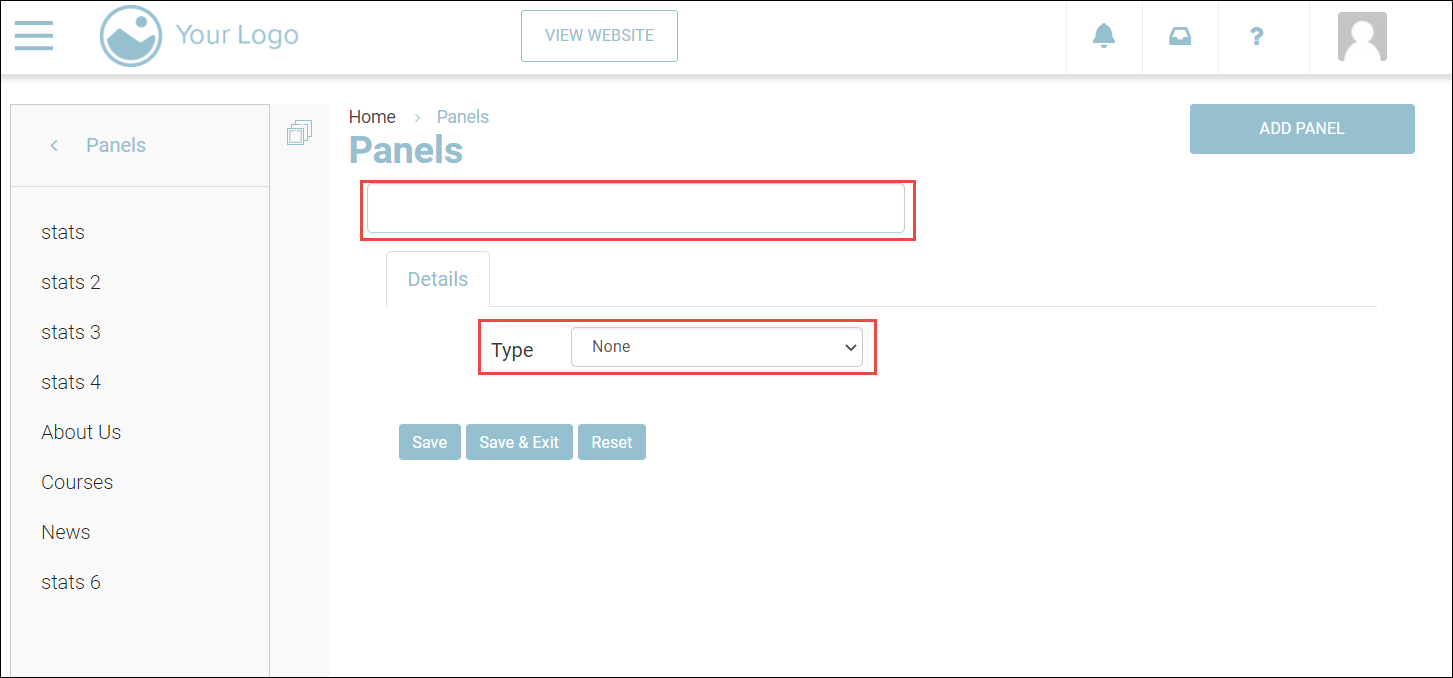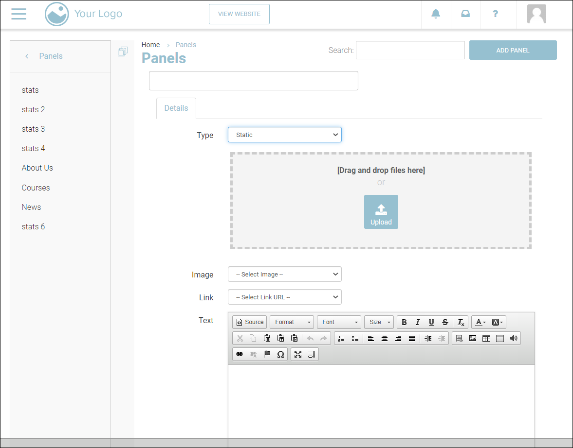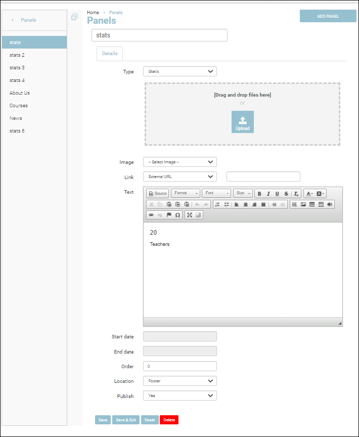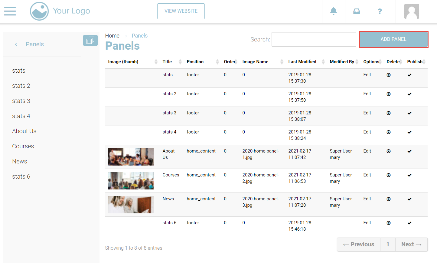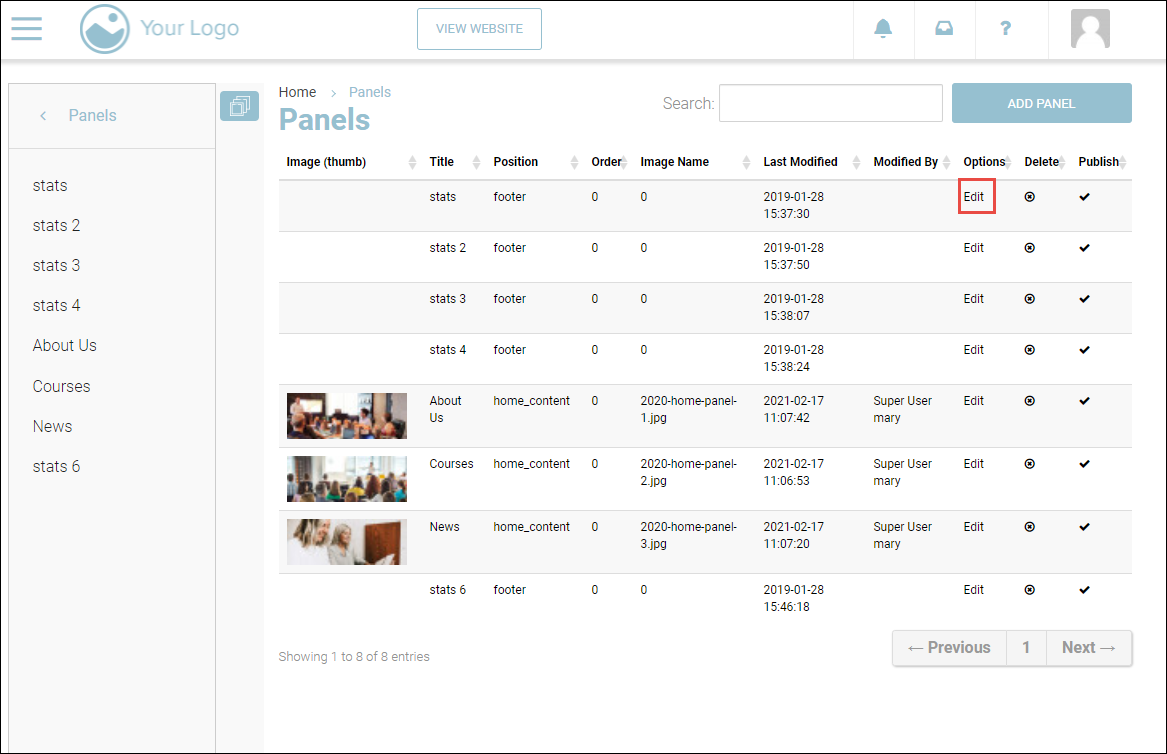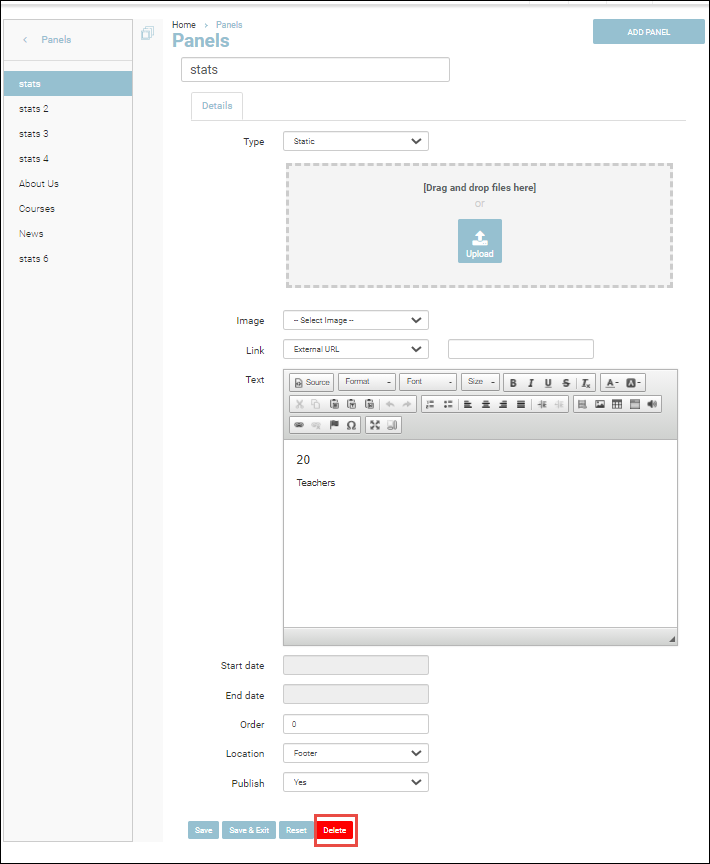 If you wish to permanently remove a panel from the website, you can do so with the Delete option.