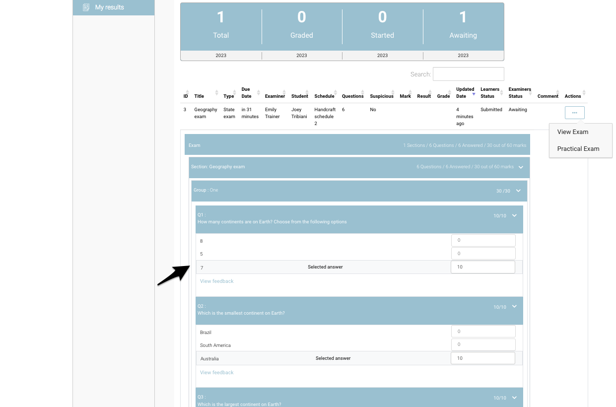 Submitted exams are automatically available for the trainer to grade.