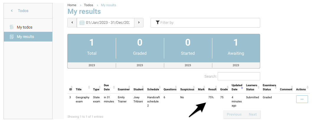 You will be redirected to Todo records for submitted exams. In this image below, only 1 submission is received. It may vary trainer to trainer.