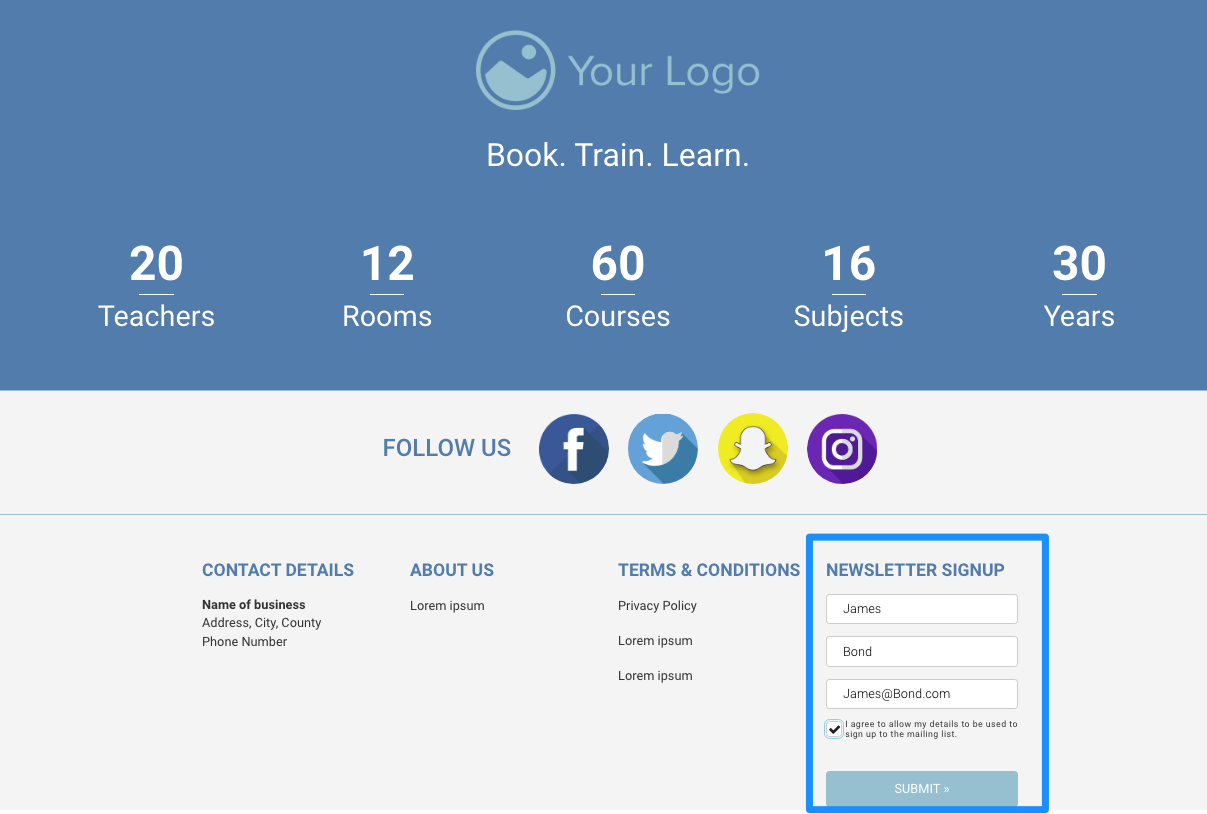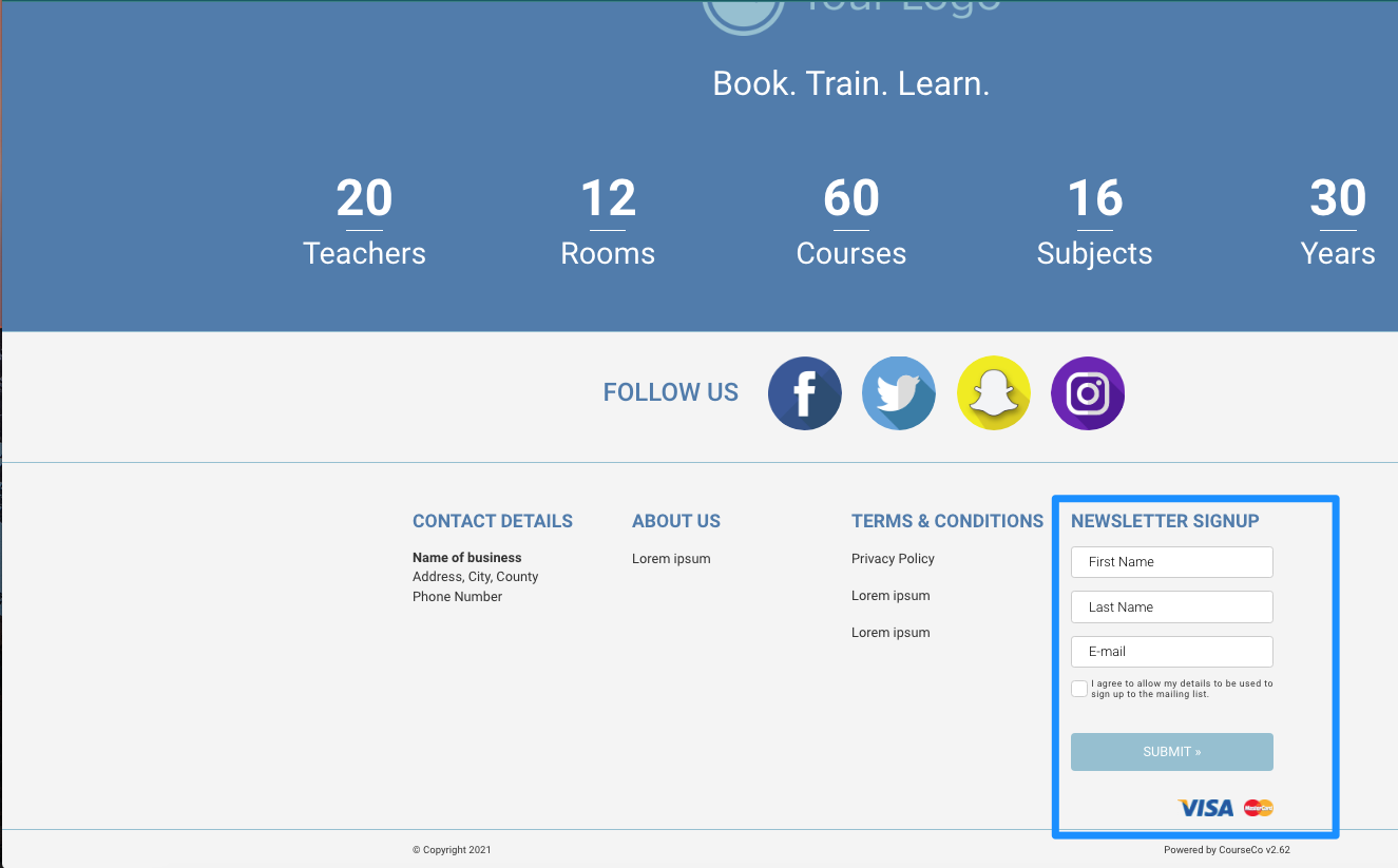 With CourseCo’s Newsletter Opt- In options, your clients can subscribe and opt-in to the newsletter so that they will be able to receive any updates sent out through you.