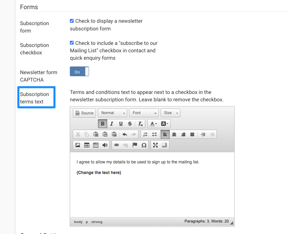 As an admin, you can edit and change the text that appears when a contact agrees with the terms and condition of signing up for a newsletter subscription.