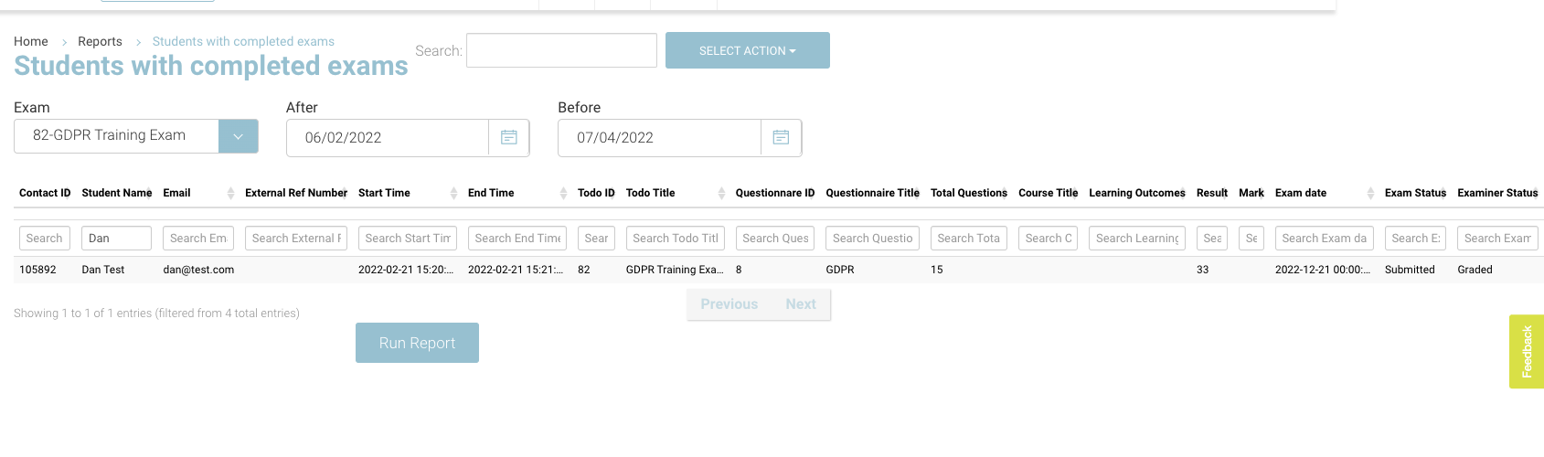 The ‘Student with completed exams’ report shows a list of students who have completed their exam. You can filter by the exam name and list will be presented when you run report. To run the report: