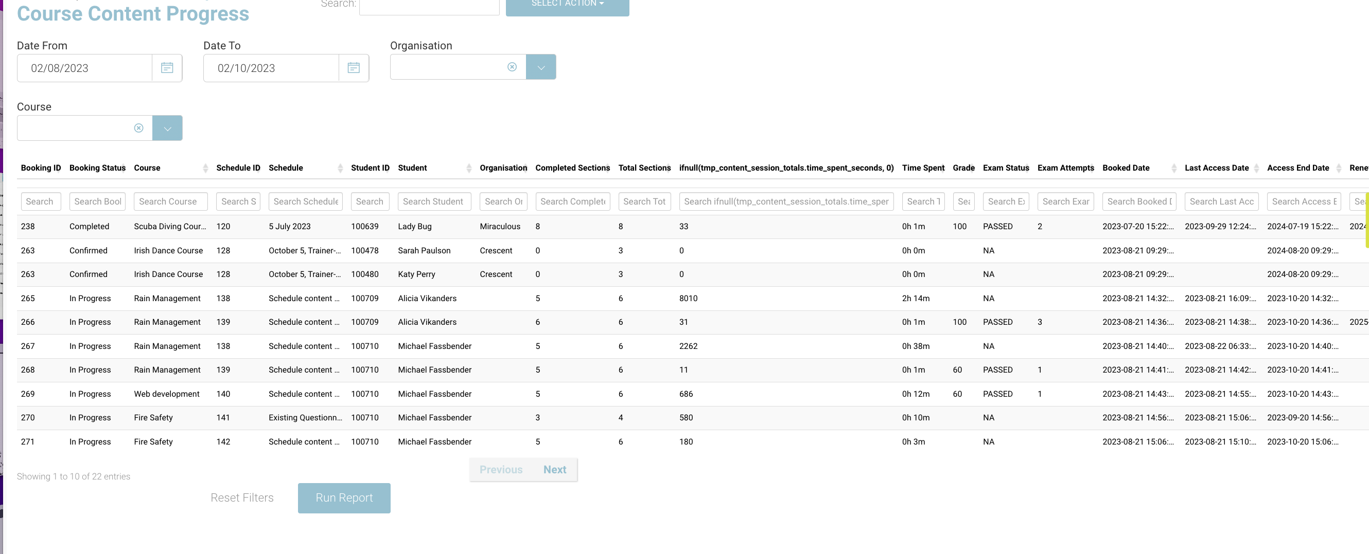 Additionally, you can also search by Student name, organisation, course, schedule to filter the report