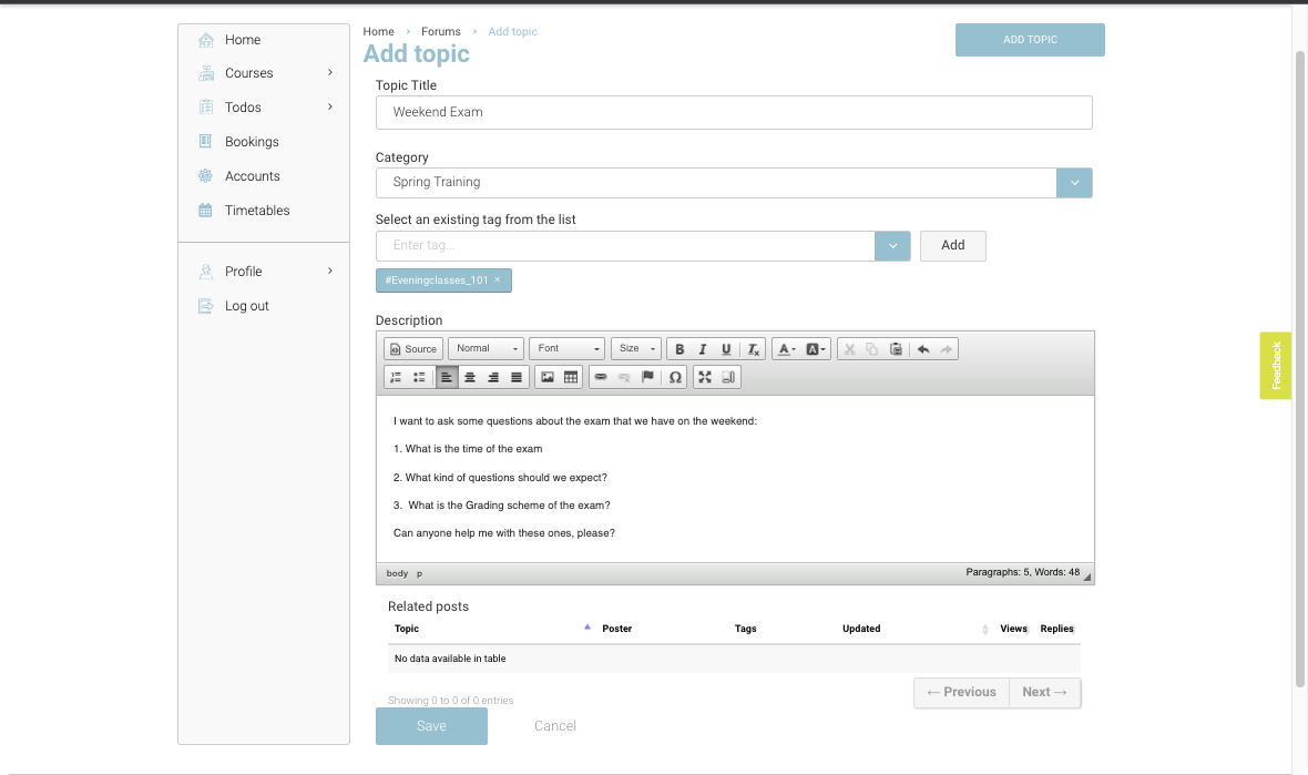 Students can add a topic and assign applicable categories and tags